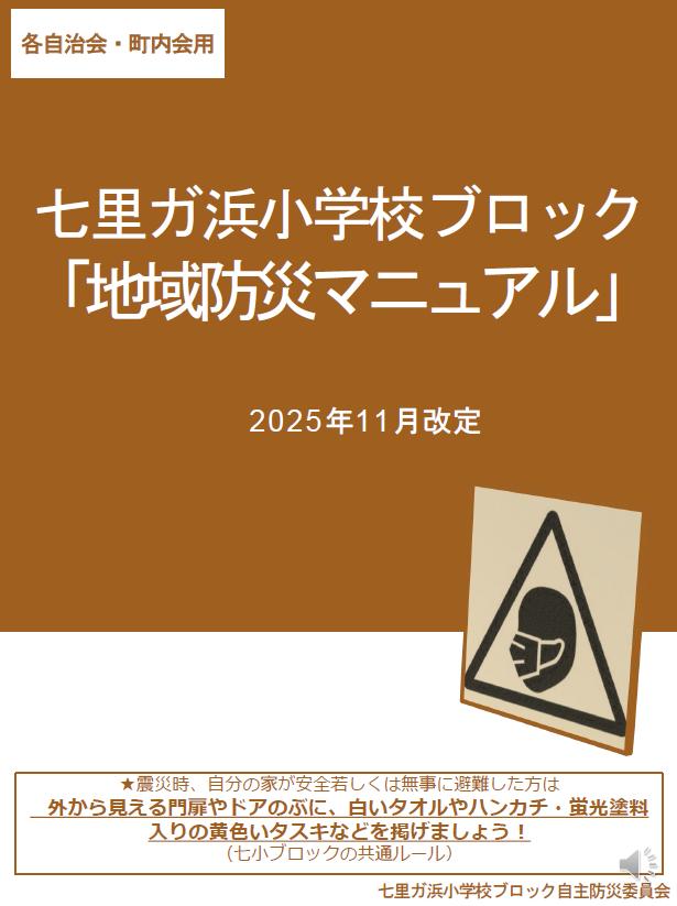 鎌倉市『防災のてびき』『ミニ防災拠点運営マニュアル』を参考に、七里ガ浜自治会向けに作成した地域の防災マニュアル。(2011年4月版)必要な防災の形は家庭により様々ですから、日頃から実情に則した行動がとれるよう、一人ひとりの備えが大切です。